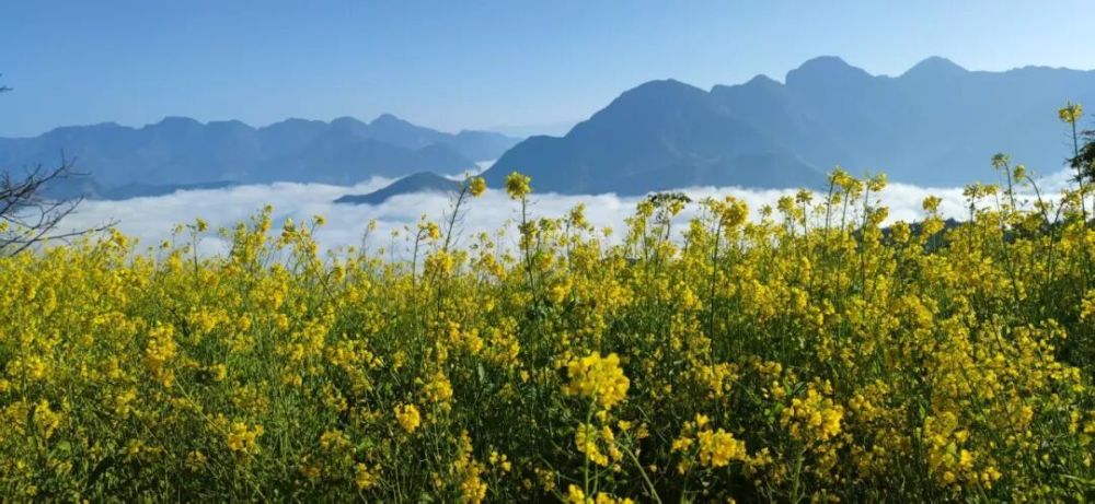 油菜花海与云海相映成趣,田埂间分布着多个景观观赏点。晨起时分,薄雾轻笼原野,翻涌的云海在山峦间舒展漫卷,与金黄花田交相辉映,形成如梦似幻的自然景观。置身田间,可见花枝上嫩黄花朵次第绽放,微风拂过泛起层层金浪;部分枝头已结出饱满菜荚,阳光穿透荚皮可见排列整齐的嫩绿色菜籽,彰显着丰收的希望。