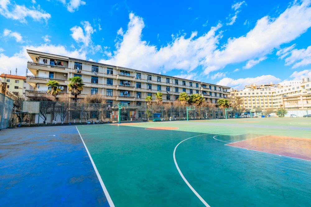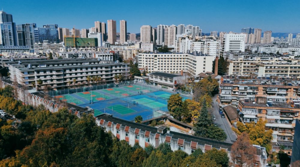 蓝天白云下的云大东二院球场和宿舍楼。云南大学 供图