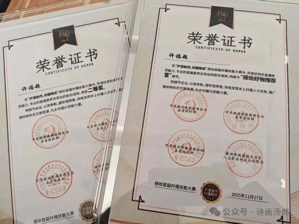 同年11月,在禄劝首届村播技能大赛中,许福超凭借扎实的带货能力、专业的直播素养和显著的助农成果,荣获二等奖,并被授予“禄劝好物推荐官”称号。她深知,推荐“好物”不仅要知其“好”——品质上乘,更要懂其“魂”——文化内涵。为此,她走进田间地头,探访每一类特产背后的自然滋养、传统技艺与人的故事。镜头前,她从容讲述,将江畔鲜果的清甜、古法红糖的醇厚、禄劝彝绣的智慧,化为有温度、有画面的语言。与此同时,她积极链接外部资源,参与各类展销活动,始终怀着对家乡的敬畏与深情,推广生态、健康、可持续的产品,以个人影响力和联盟矩阵,让“禄劝好物”走向更广阔的天地。