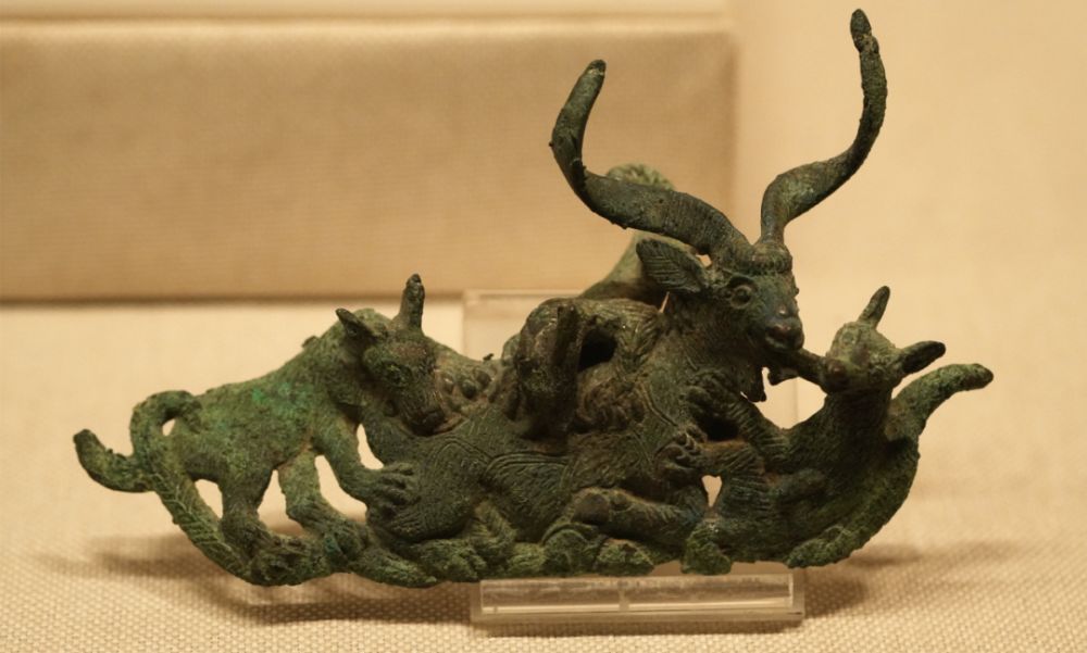 李家山古墓群还出土了大量铜扣饰,如“剽牛祭祀”“一虎噬猪”“二人猎鹿”“虎牛搏斗”等,“这些铜扣饰跟北方草原文化的牌饰有很相似的地方,我们认为当时的古滇国跟北方草原文化已经有交流。”李红成说,李家山古墓群还发现了来自印度洋的海贝、原产于古代地中海沿岸的肉红色蚀花石髓珠、雕铸有外(国)人的“祭祀场面铜贮贝器”……