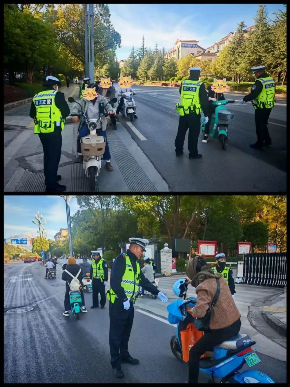 丽江交警在校园周边路段引导骑乘人员规范佩戴安全头盔,筑牢校园周边交通安全防线。(丽江市教育体育局 供图)