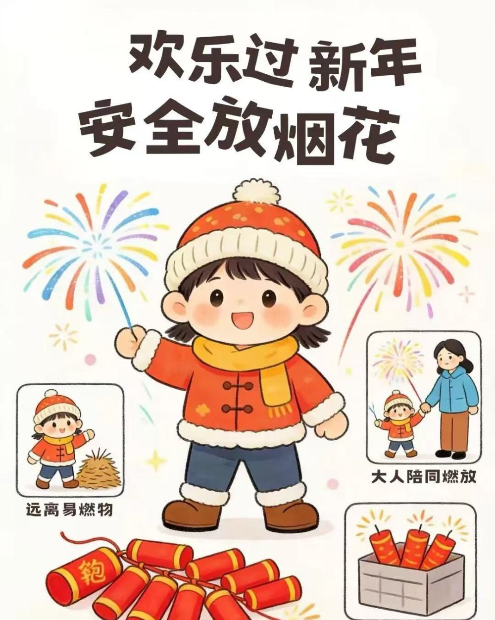 丽江市教育体育局温馨提示:欢乐过新年,安全放烟花,燃放时请务必远离易燃物、由大人陪同,并正确存放烟花爆竹。(丽江市教育体育局 供图)