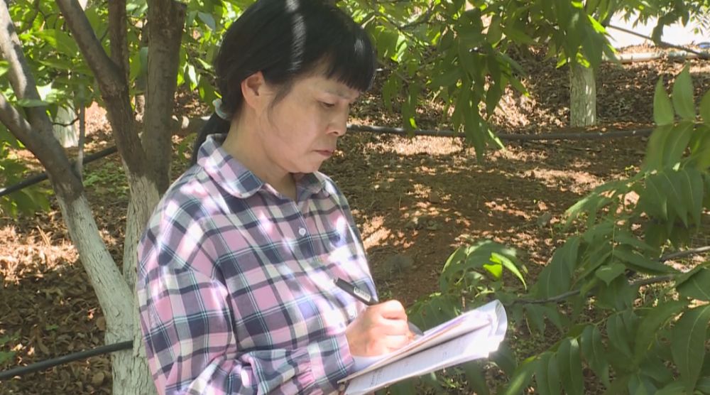 熊竹兰在核桃种植园记录核桃树长势情况。(视频截图)