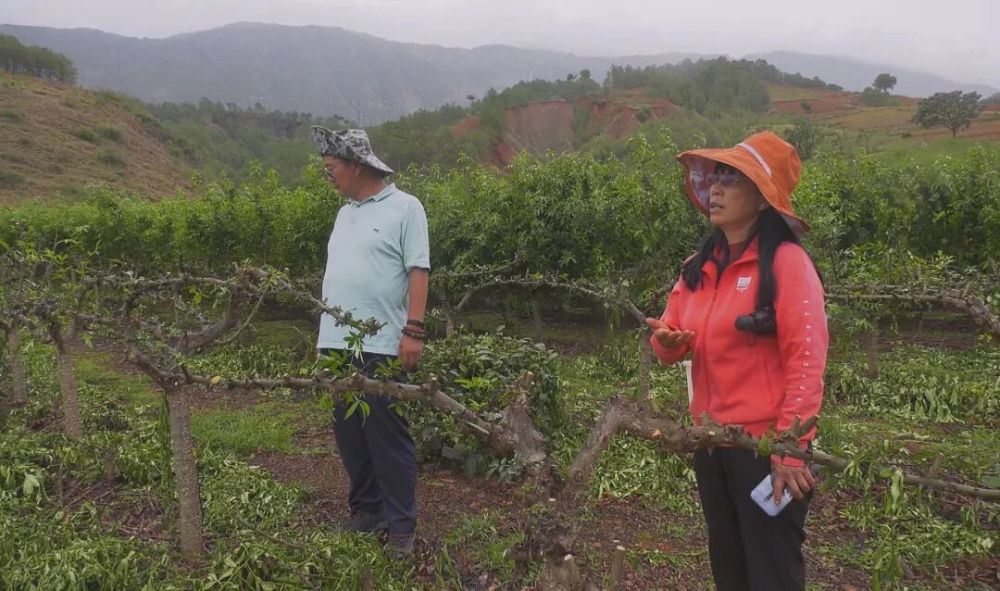 市政协委员熊竹兰(右)在花椒种植园检查花椒树修剪情况。(视频截图)