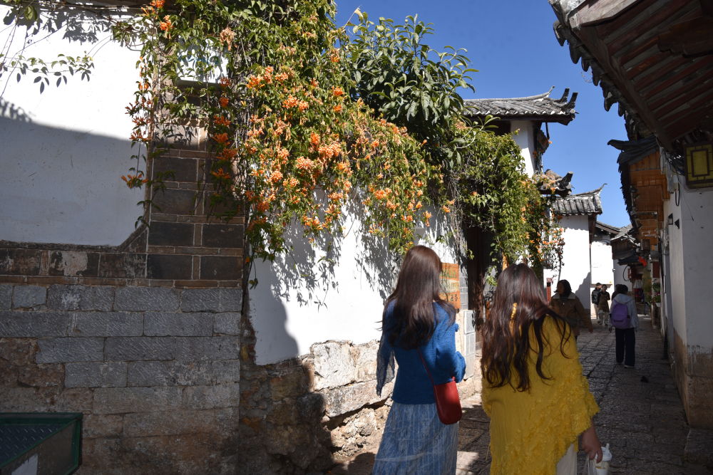 这份“橙”满人间的热烈,既与古城的静谧相映成趣,也让纳西风格的建筑多了几分流动的韵律。五花石板路被冬阳晒得微暖,炮仗花的藤蔓如霞帔覆于檐角,花枝垂落如帘,遮不住青砖白墙的温润,反倒衬得古城小巷更显质朴。