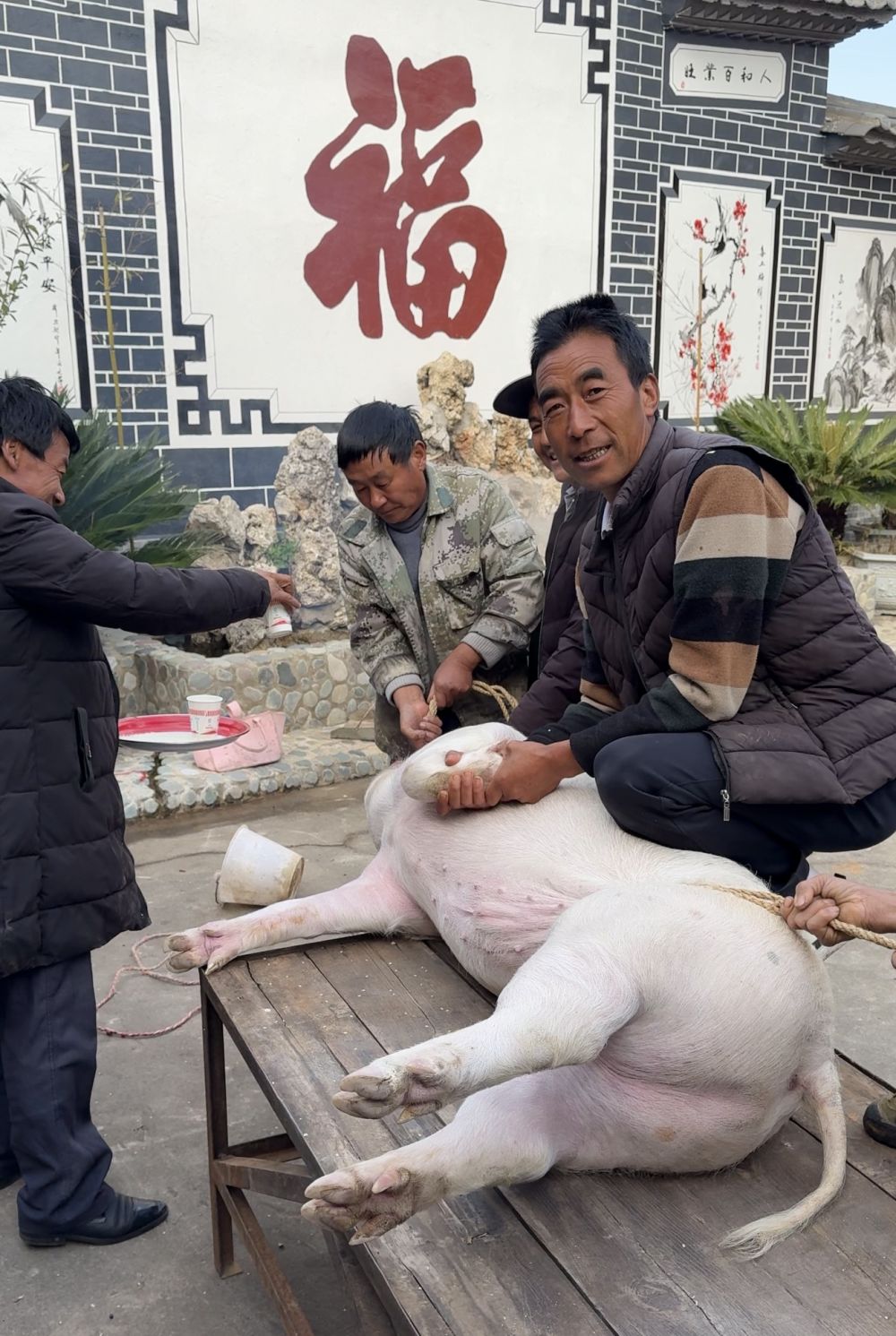 此时,猪圈旁早已围了几个壮实的汉子,每个人手里都攥着提前备好的麻绳。阿爸从堂屋取来三炷香,点燃后插在猪圈门口的香炉里,青烟袅袅间,他双手合十,拇指抵着眉心祈福:“愿来年五谷丰登、六畜兴旺……”围在一旁的亲戚朋友也都屏息静立,连院坝里的大黄狗都收敛了声响。这是杀猪前的“祭猪仪式”,敬畏自然、感恩生灵的理念,就藏在这袅袅青烟中。随着阿爸一声吆喝,壮汉们一齐上前,用麻绳精准套住猪的四肢,肥硕的生猪被稳稳抬到院坝中央的杀猪桌上。院坝里早已架起了大铁锅,柴火在灶膛里噼啪作响,蒸腾的热气在冷空气中凝成白雾。阿妈和几个阿姨围在锅边,手里麻利地收拾着碗筷,竹篮里装着刚从菜园摘的蒜苗、芫荽,自家腌的酸萝卜散发出诱人酸香。丽江人的杀猪宴从不马虎,每一样食材都带着乡土的本味。壮汉手持锋利的尖刀,动作干脆利落,温热的猪血顺着杀猪桌的边缘,缓缓流入下方的瓷盆,阿妈会趁着猪血还未凝固,加入盐巴搅拌均匀,这是制作米灌肠的上好原料。
