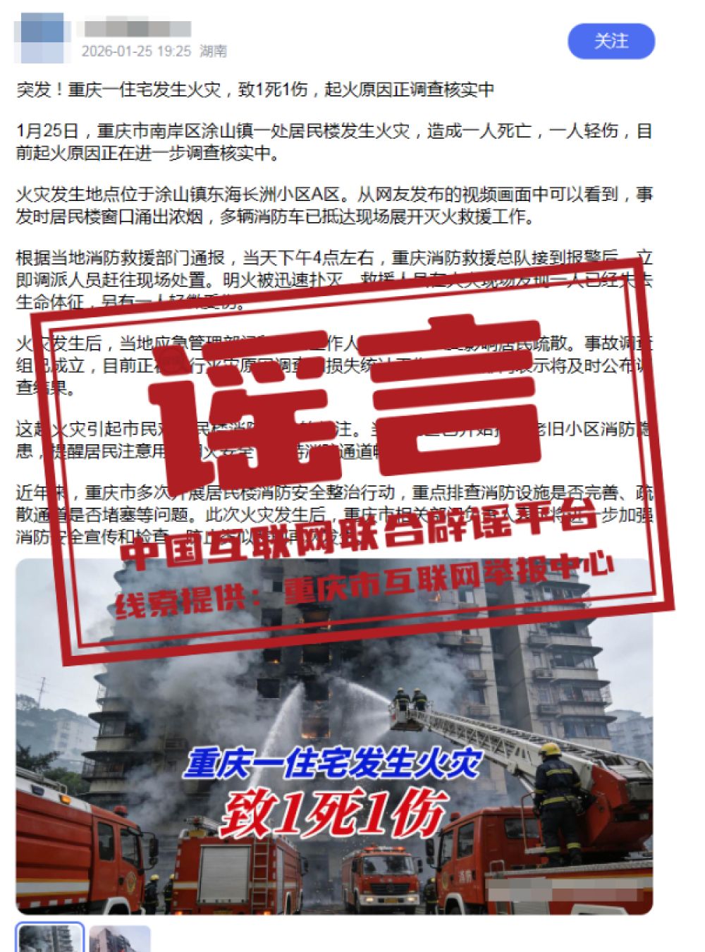 真相:1月25日,有网民在互联网发布信息称“重庆市南岸区涂山镇一处居民楼发生火灾,造成一人死亡,一人轻伤”,引发关注。经向南岸区消防部门核实,1月25日南岸区涂山镇未发生火情,网传信息不实。目前,警方正对造谣者展开调查。(来源:“重庆辟谣”微信公众号)