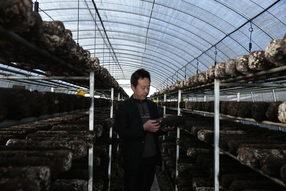 在丽江中源绿色食品有限公司,技术人员在查看菌棒生长情况。(丽江融媒记者 赵庆祖 摄)