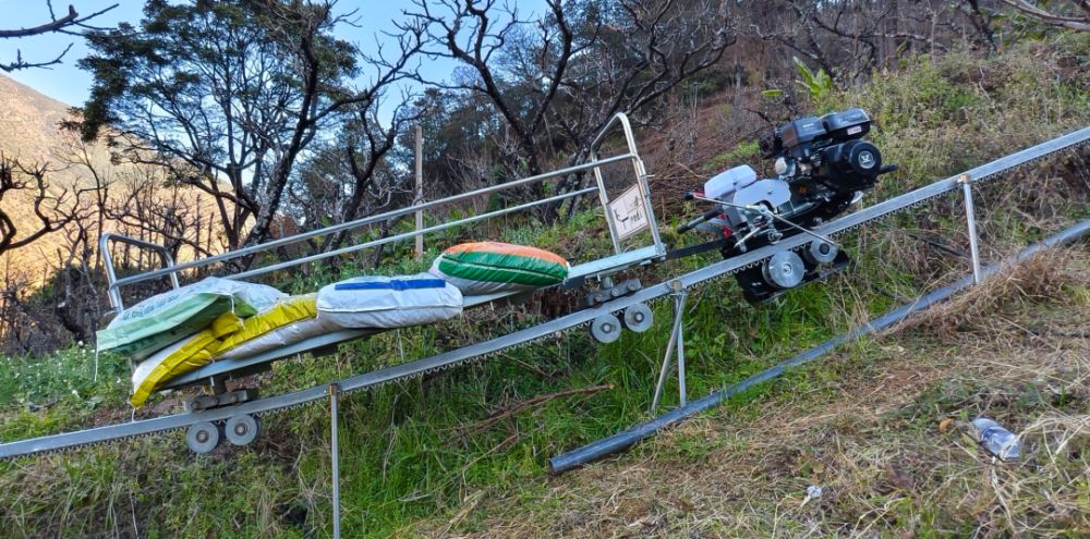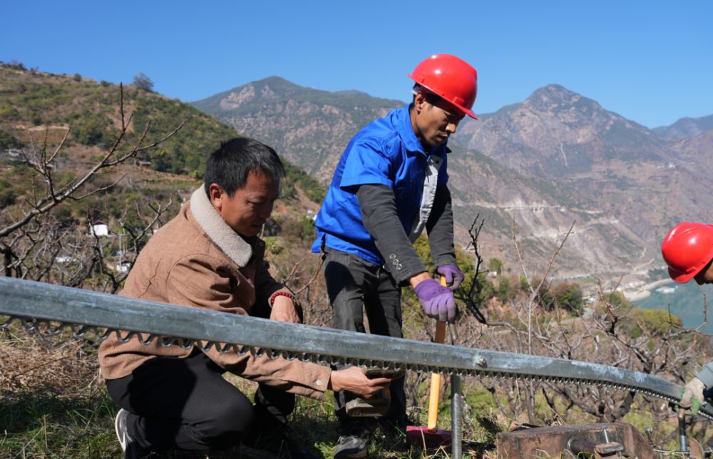 在古城区文化街道办事处东江社区的山脚下,机械作业的声响打破了山的宁静。丽江芳源农业科技开发有限公司负责人谢方华正带领员工安装山地单轨运输设备,他俯身查看轨道衔接处叮嘱着:“把高度再往下调一点。”安装过程中,他向记者介绍眼前这套“农运利器”:“我们从早上7:30忙到现在,基础安装工作已经完成得差不多了。等会儿我们采取边安装边运输的方式,用这套设备把材料往山上送。”