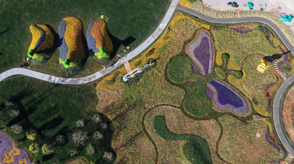 在滇池东岸,一幅生态画卷正徐徐展开——5万盆鲜花织成了一只身姿优雅的巨型孔雀。作为昆明第二大孔雀造型花坛,它静立于湖畔,与滇池的湖光山色相映成趣。蝴蝶与蜜蜂造型的花带环绕其间,宛如春风途经时不经意洒落的绚烂笔触;从高空俯瞰,整幅景观恰似一幅流动的彩色织锦,在滇池畔静静铺展着属于春城的盎然诗意。