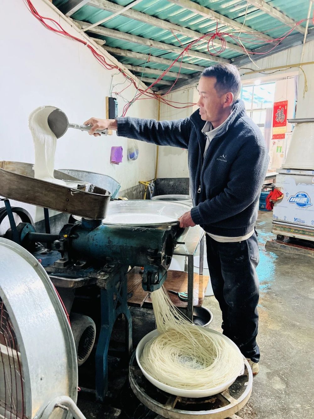 如今,作坊虽引入了半自动化设备,却始终保留着最核心的手工环节。浸泡、蒸制的水量和时间仍凭夫妻二人的经验把控,揉捻塑形依旧坚持手工操作。杂粮饵块的配方,更是徐香芹历经无数次调试摸索出的黄金配比,将杂粮与粳米按比例混合,既要保证杂粮的营养与香气,又要兼顾饵块的软糯口感,不能有丝毫偏差。延伸出的产品线——米线,更是延续了传统工艺的精髓:米浆的浓度、漏丝的温度、冷却的时长,每一个细节都凝聚着17年来积累的经验。“做吃食,就得实在。用料真、手艺到,大家才会一直买、一直吃。”刘朝勇朴实的话,道出了匠人的坚守,流水线可以提升效率,但无法替代指尖对食材的感知,更不能复制岁月沉淀的经验。
