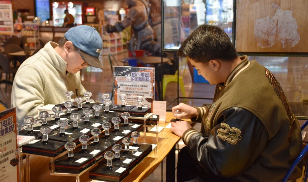 影迷在电影票兑换的明信片上盖章。(丽江融媒记者 杨四娟 摄)