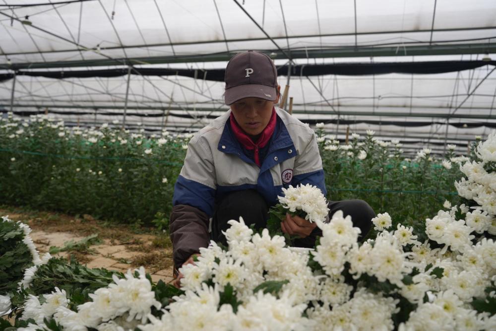 据威信梵花农业科技发展有限公司技术员赵家勇介绍,基地菊花可稳定种植两季——夏季种植通过摘心技术提高产量,冬季则采取双株种植,采用增温块提升棚内温度,有效防止花朵冻坏,实现错峰、反季节生产,品质和产量均有保障。每季可收获4—5轮鲜切花,每亩可采摘鲜花12万枝。