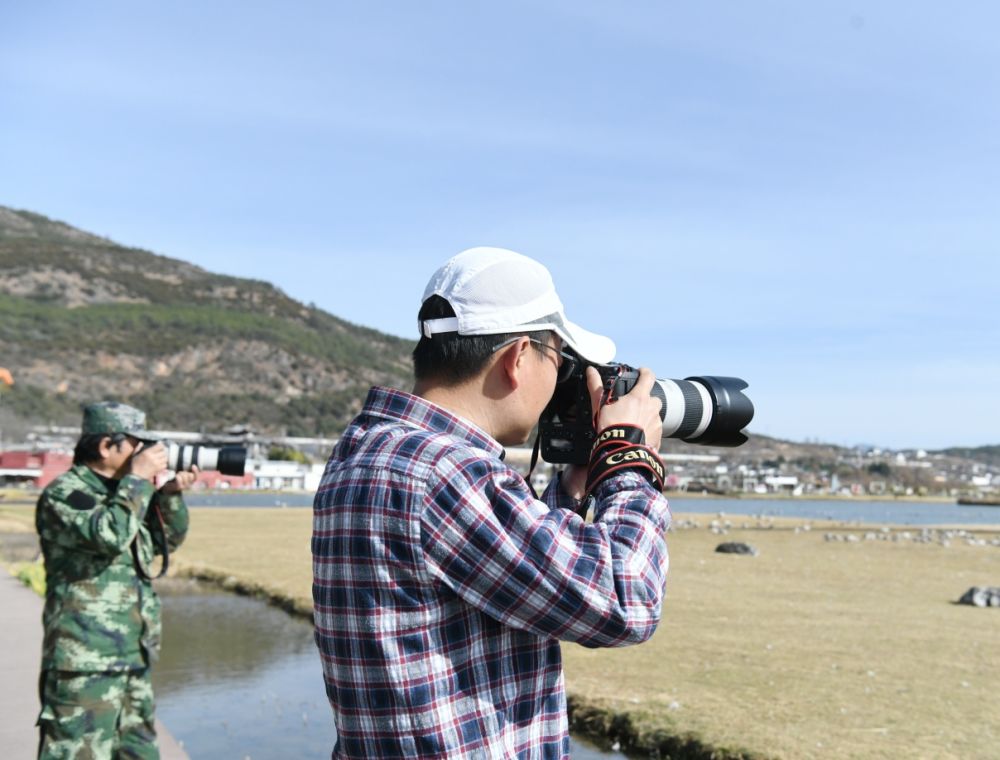 摄影师在拉市海湿地拍摄候鸟。(丽江融媒记者 赵庆祖 摄)