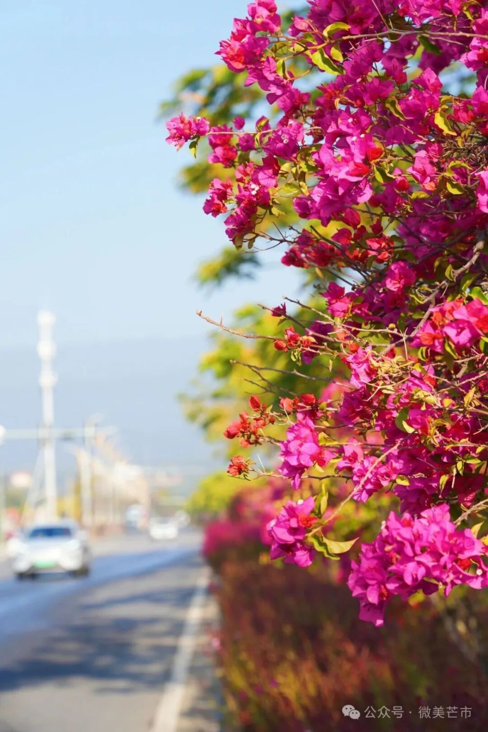行走在芒市街头,最引人注目的莫过于随处可见的三角梅。它们从街边绿化带蔓延至小区围栏,再热烈地攀上公园的廊架。风来时,花枝随风摇曳,成片浓紫、嫣红与亮橙泼洒出灿烂的节奏,让整座城市显得热闹又鲜活。
