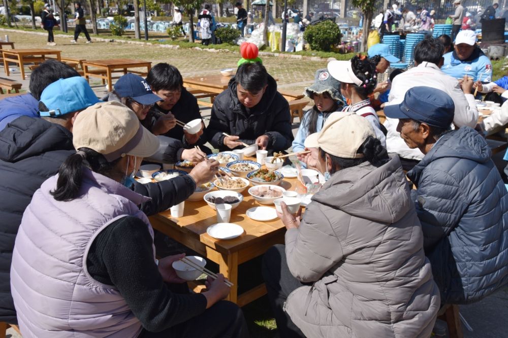 赛事落幕,情谊不散。体育场旁的“杀猪宴”体验区内,农家十大碗、炭火烤肉等美食香气扑鼻,两地球迷围坐一堂、促膝畅谈,从赛场表现聊到观赛体验,从地域风情谈到生活趣事,欢声笑语中,城市的距离悄然拉近,心与心的联结愈发紧密。