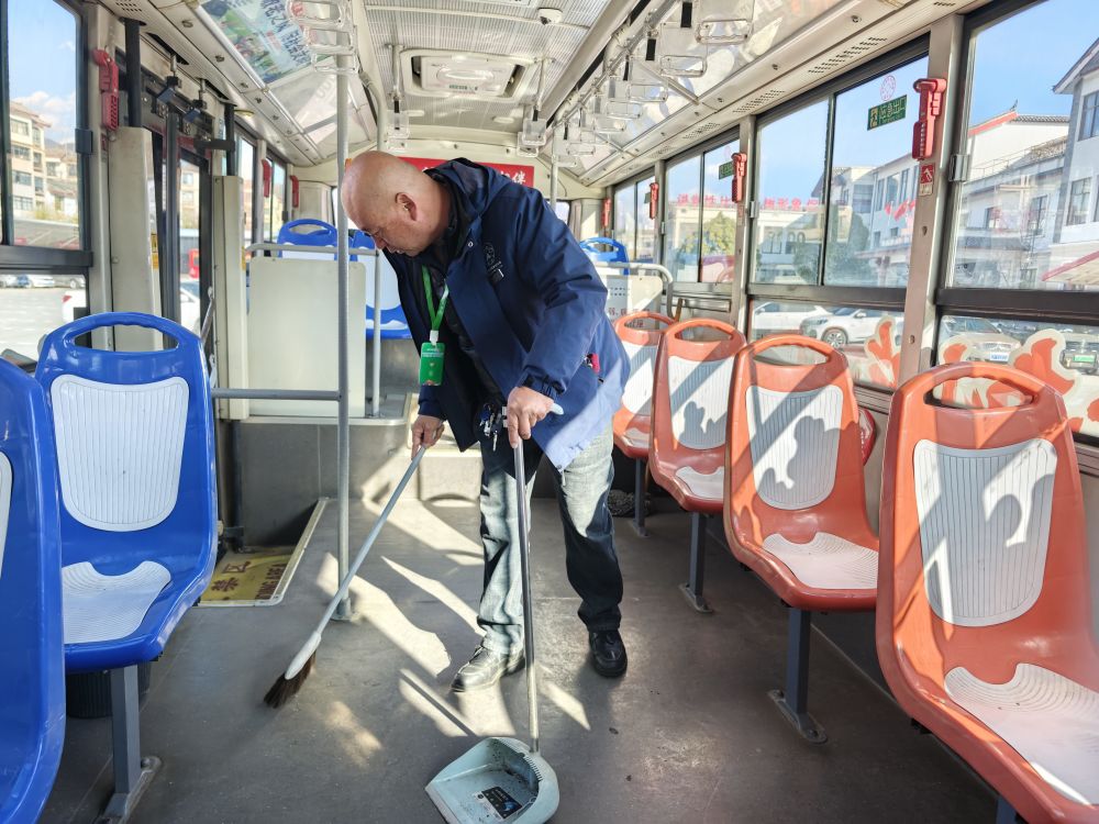 王勤军打扫公交车内卫生。(丽江融媒记者 左林珏 摄)