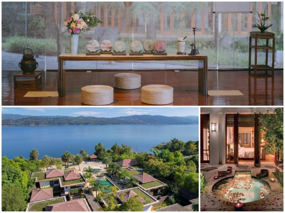 柏联酒店紧邻阳宗海,打造21栋独立别墅,每栋配备私人泳池、温泉泡池、发呆亭及开放式庭院,老茶博物馆,室内空间以大面积落地窗模糊室内外界限,带来“躺在床上看海”的视觉体验。
