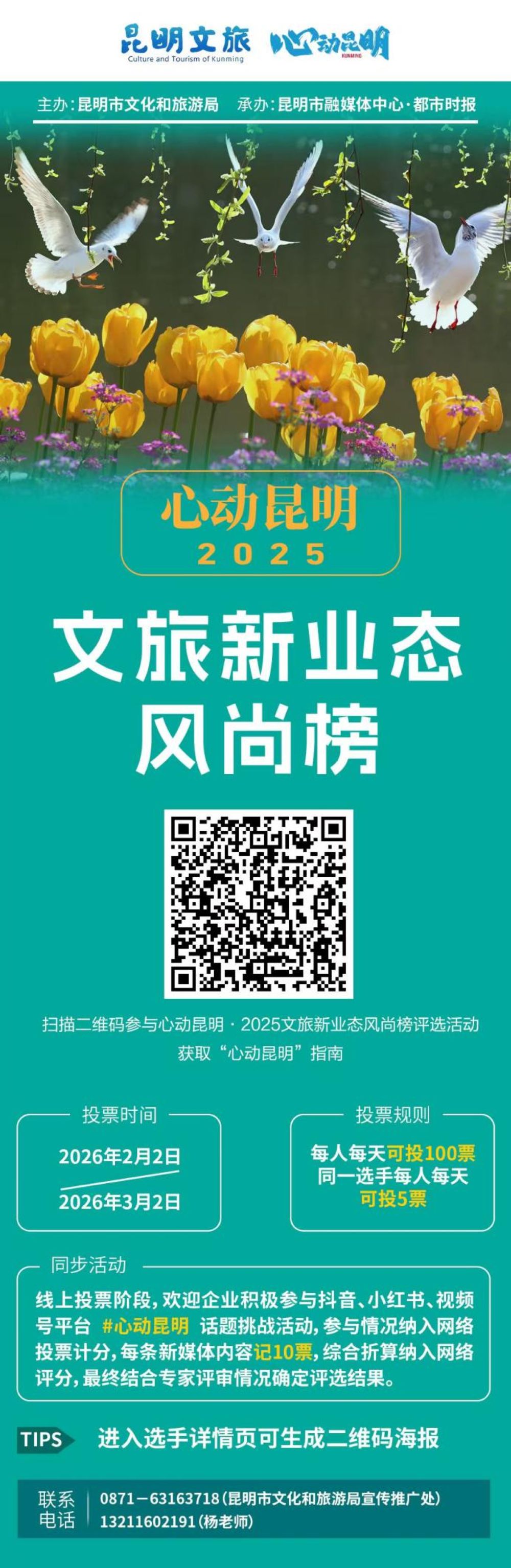 春节期间,由昆明市文化和旅游局主办、昆明市融媒体中心承办的心动昆明·2025文旅新业态风尚榜评选活动持续进行中,参与此次评选的文旅新业态涵盖了“吃住行游娱购”各方面,具有特色的咖啡馆、茶空间、美食餐厅、星级酒店、旅游民宿、特色街区园区以及好景,关注活动,可解锁更多令人心动的昆明文旅新场景,尽情领略春城之美。