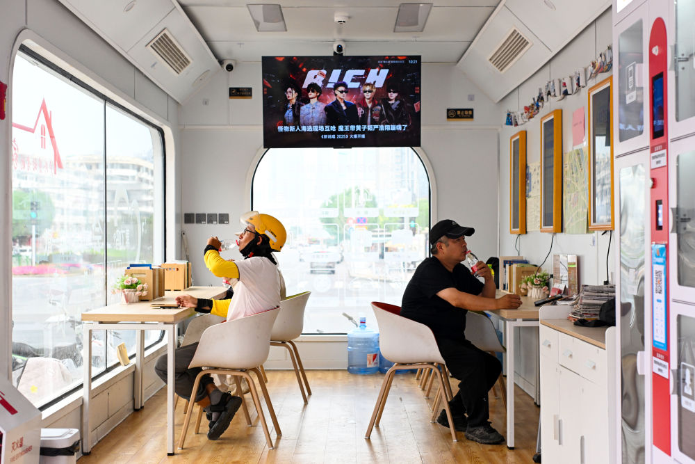 2025年6月9日,几名户外劳动者在天津市河西区文化中心工会驿站休息。2025年12月发布的数据显示,全国已建工会驿站18万个、货车司机之家2187个,有效解决劳动者“吃饭难、喝水难、休息难、如厕难”等现实问题。