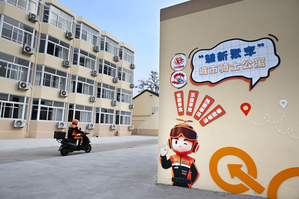 2026年1月14日,一名骑手骑车返回青岛市李沧区“青暖红骑之家”。2025年,山东省青岛市启动“骑手安居工程”建设,利用闲置房产打造多处爱心骑手公寓。公寓里配有共享食堂、平价超市、理发店、修车充电点等,形成服务功能完善的微型社区,为骑手生活提供便利。