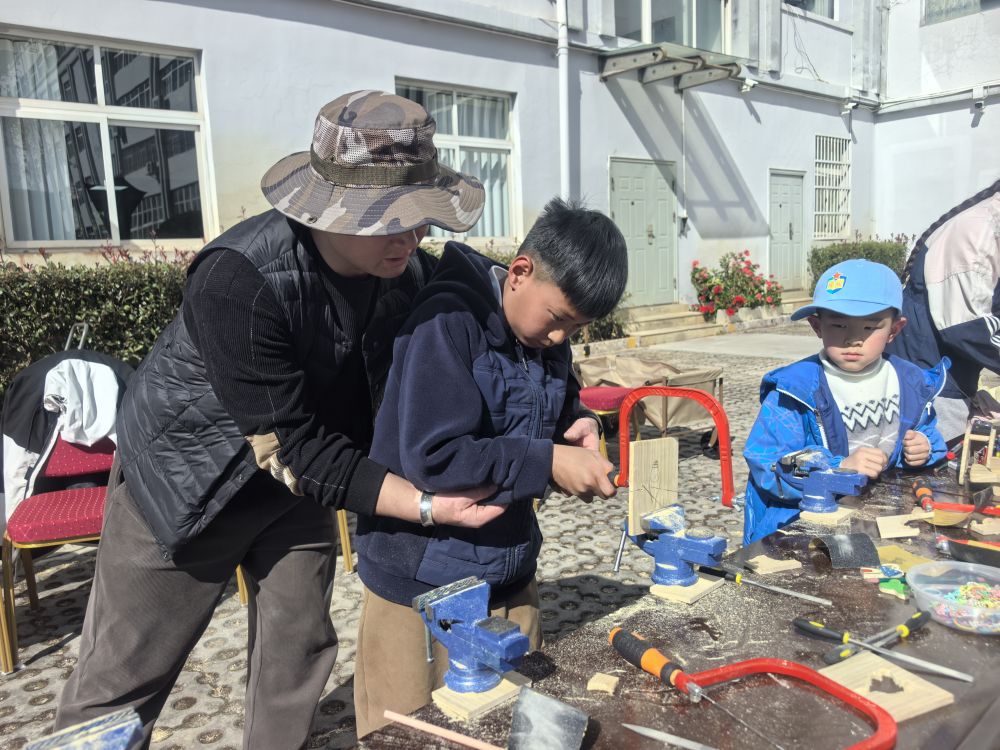 小朋友在体验制作木质工艺品。(丽江融媒记者 侯玮 摄)