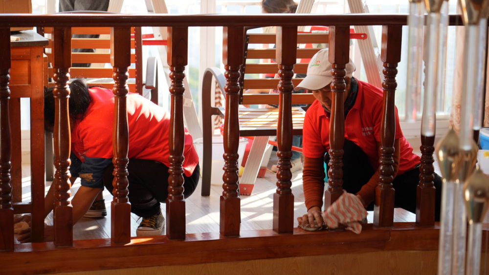在山水蓝岸二期的一户居民家中,7名保洁人员正有条不紊地穿梭于各个房间,开展全屋深度保洁工作。她们手持专业工具,细致擦拭厨房油污、清扫地板灰尘、整理家居杂物,原本略显杂乱的房间渐渐变得窗明几净、井然有序。“年底了工作也比较忙,家里也需要一次彻底的大扫除,特别是玻璃比较难清洗”杨女士笑着说,“请专业的家政公司,他们弄得比较干净,可以说我们是非常满意的。”