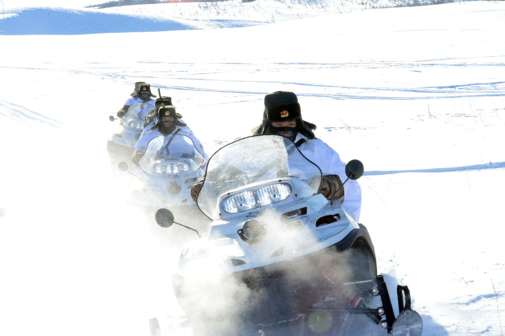 北部战区陆军某旅三角山边防连官兵驾驶摩托雪橇执勤。新华社发(2014年1月摄)