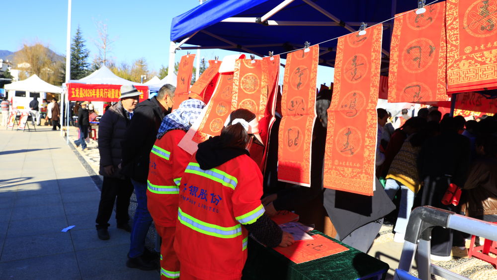 现场,墨香氤氲、笑语盈盈,洋溢着喜庆祥和的节日氛围。在春联书写区,玉龙县文联组织的12名书法爱好者凝神挥毫,“骏马奔腾迎新岁,吉祥如意贺佳节”等一副副寓意美好的春联与一个个“福”字跃然纸上,传递着对新春的美好祝愿。其中,用东巴文书写的春联,因其独特的民族韵味备受青睐。“这样的免费送春联活动特别好!”绿化工人树光渊说。据玉龙县文联主席和凤琼介绍,当日送出1000余副春联,将浓浓的节日祝福送入千家万户。