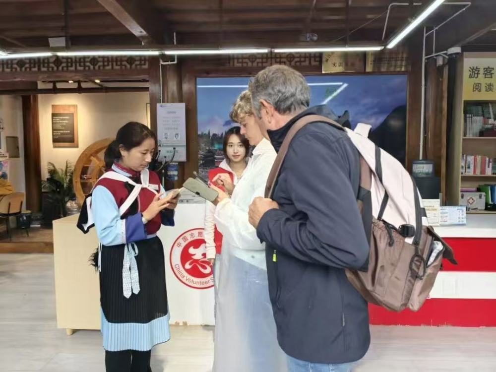 丽江古城景区工作人员和志云为游客讲解。(和志云 供图)