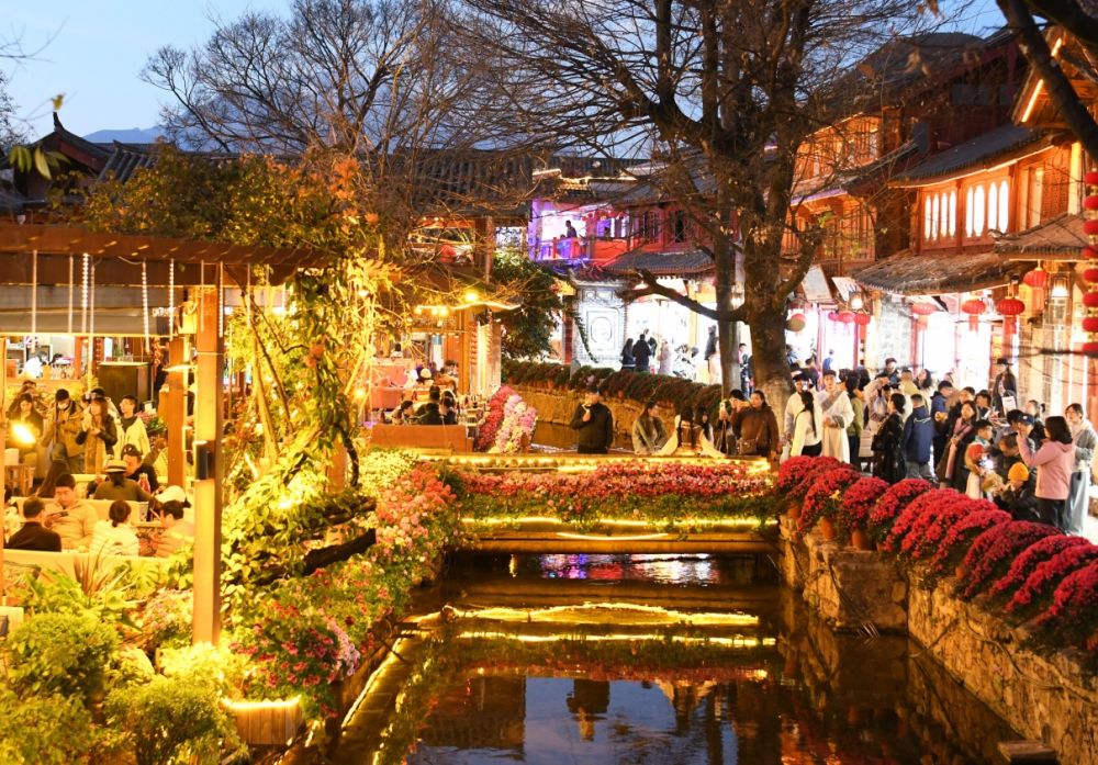 夜幕降临后,丽江古城灯火璀璨,年味十足。来自全国各地的游客穿梭其间,欣赏古城夜景,品味丽江美食,夜间消费市场呈现出一派热闹景象。