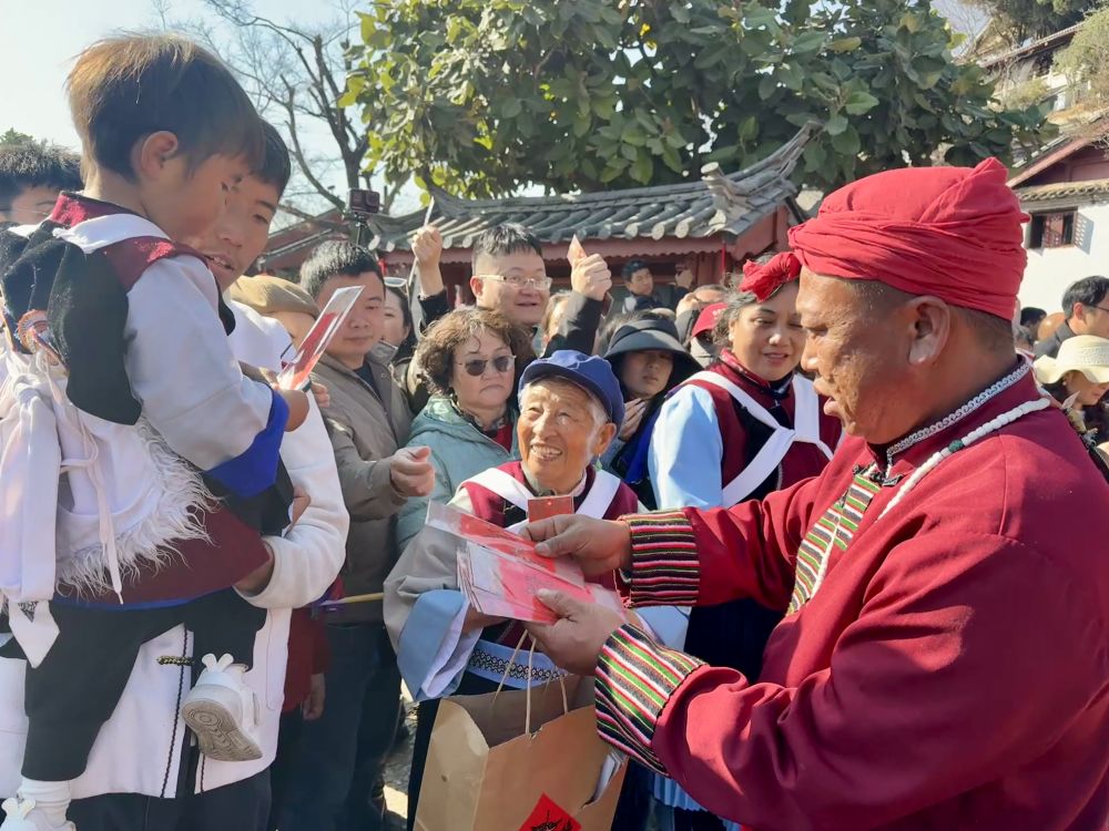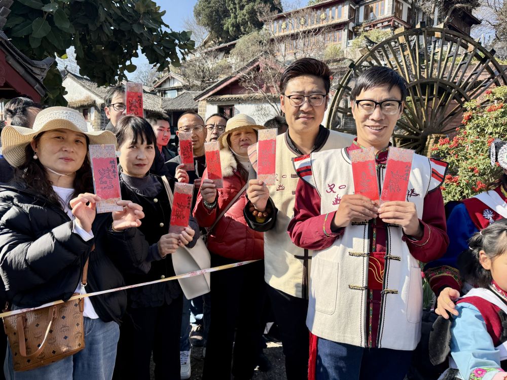 活动尾声,工作人员向在场市民与游客赠送写有东巴祝福语的红纸书签,将吉祥寓意送至他们手中。“收到这份祝福特别激动,也希望我们的祖国更加繁荣昌盛,各民族像石榴籽一样紧紧抱在一起。”来自河北的游客李京说。