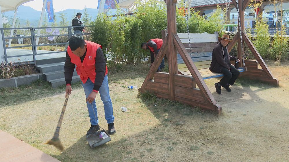 拉市海景区海东马场周边志愿者打扫卫生。(丽江融媒记者 张丽瑶 摄)