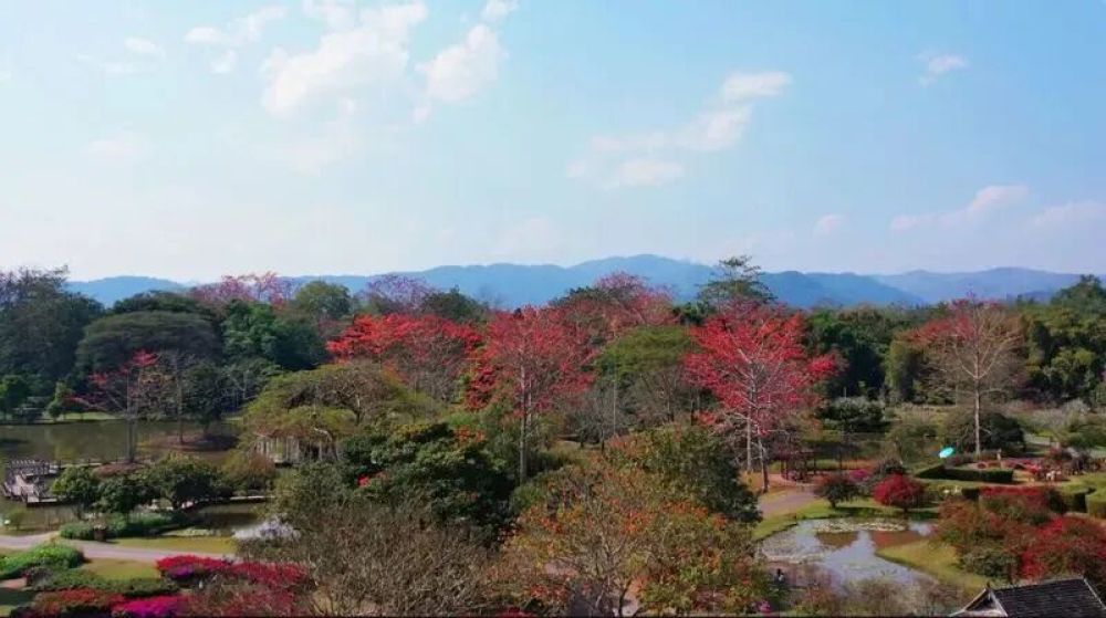 春节期间,园区内攀枝花、火焰花、鹤顶兰、绿玉藤、烟火树、无忧花等热带花卉竞相开放,为节日增添一抹绚丽色彩。漫步雨林,仿佛置身画中。
