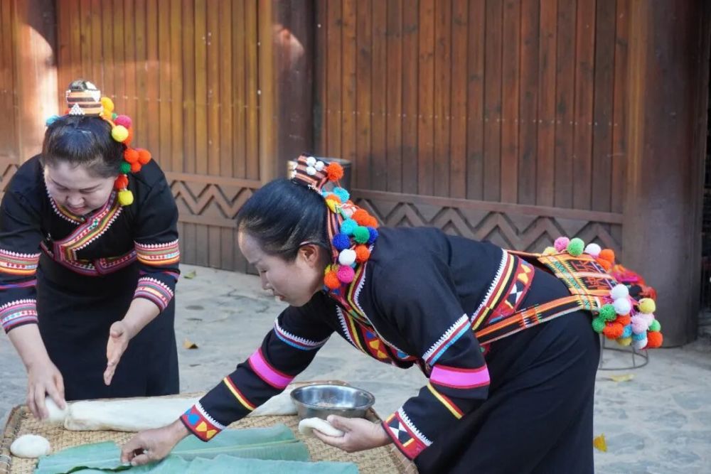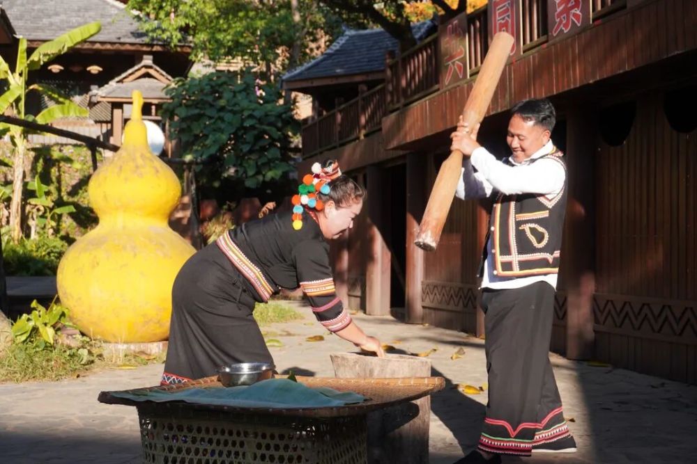 当落日的余晖洒上拉祜族传统的干栏式建筑,村民又聚在一起。“我去摘几片新鲜的芭蕉叶。”“我们准备糯米和芝麻。”“我力气大,我来负责捣!”大家迅速分工,为舂粑粑忙活起来。“粑粑意为团团圆圆,是拉祜族过年不可缺少的习俗。”李石开一边向围观游客介绍,一边用木棍反复捶打着碓窝中的糯米。待糯米变得细腻柔软,大家便一起将其分成小份,在芭蕉叶上揉成圆饼。一句句祝福随着一个个圆圆的粑粑被送到远道而来的客人手中。欢笑声、鼓劲声和歌声交融,酿出浓厚的节日氛围。