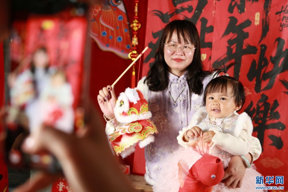 人们在云南蒙自东大街“全家福”拍照打卡地拍新年照片(2月17日摄)。新华网发(薛莹莹 摄)