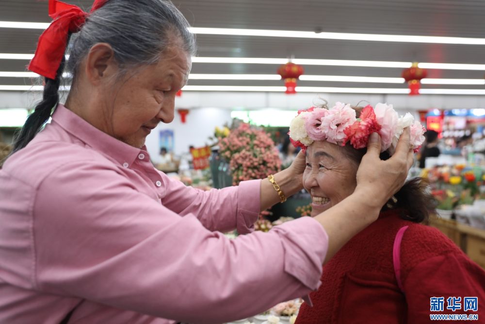 来自浙江的游客在昆明斗南花卉市场挑选试戴花环(2月22日摄)。新华网发(薛莹莹 摄)