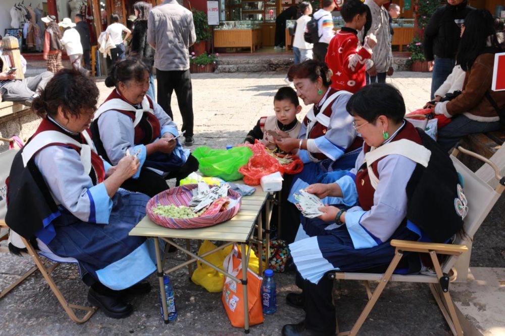 新义社区居民身着民族服装在卖草场打牌聊天。(供图)