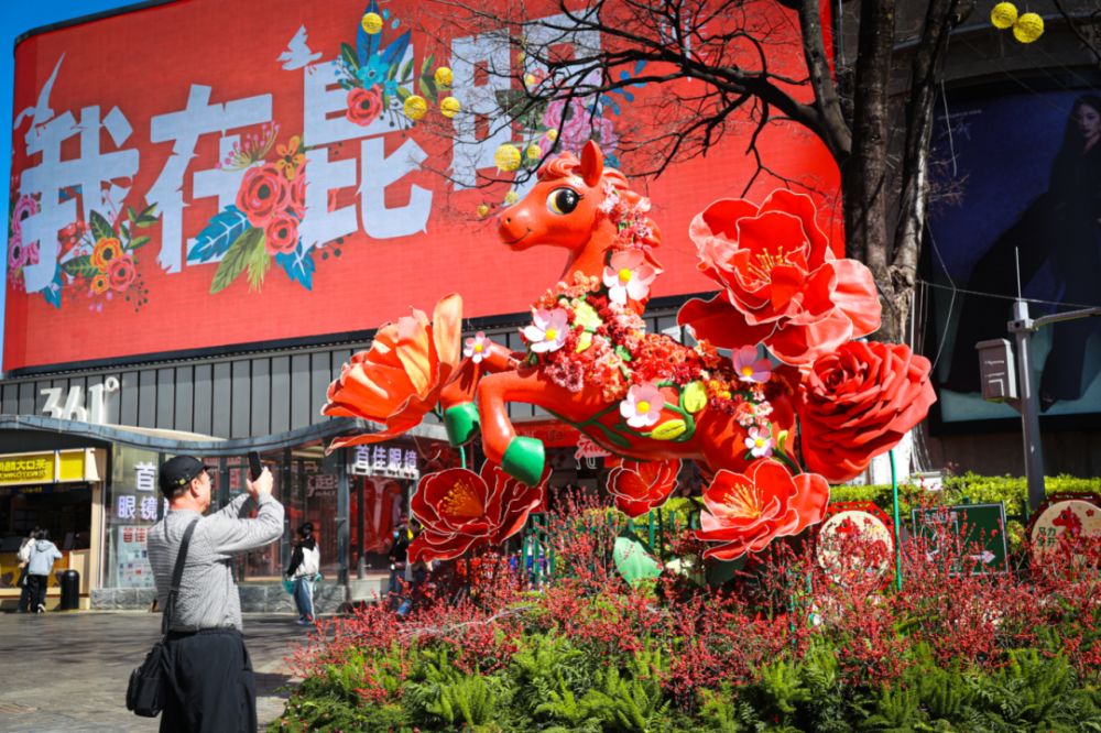 在顺城、南屏街、公园1903等商圈,人流依旧涌动。走马灯基底的生肖马缀满山茶,身披宋锦的骏马腾空而起,“时驹”昂首承载新岁期许,非遗技艺与春城花卉相融,每一处装置都藏着昆明的风情与马年的祥瑞。