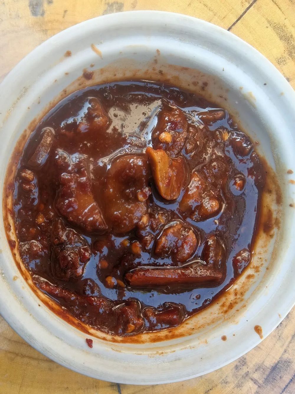 拌好的蚕豆酱,装进大土罐里,用纱布封好口,再盖上盖子,小心翼翼地搬回阁楼。接下来的日子,就交给时间去酝酿。半年后,等到来年春夏,打开土罐的那一刻,香气能飘满整个院子。金黄泛红的酱体透着油光,豆香、菌香、草药香交织在一起,闻一口就沁人心脾,我舌尖上的味蕾被彻底唤醒。夹一筷子放进嘴里,绵软细腻,咸香适中,还有一丝淡淡的草药味,我就着这一小碟,能轻轻松松吃下三大碗米饭。