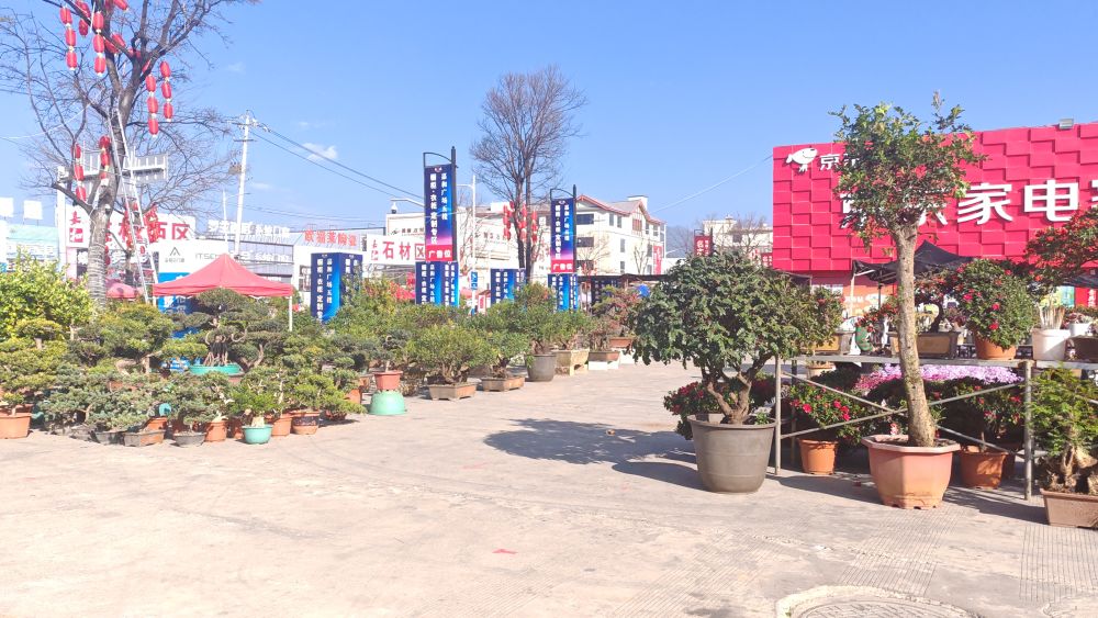 中心商贸城内人心攒动,农具、花卉、苗木琳琅满目。镰刀、锄头、扫帚、铲子等农具一应俱全;报春花、三角梅、多肉、本地海棠等花卉竞相绽放;腐殖土、羊粪等各类园艺肥料备货充足。市民驻足挑选,选购春耕物资与绿植盆栽。
