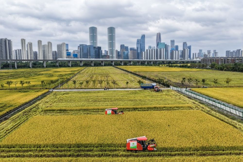 2025年10月21日,收割机在浙江省杭州市萧山区世纪田园粮食功能区的稻田里收割水稻,远处高铁列车飞驰而过(无人机照片)。新华社记者 徐昱 摄