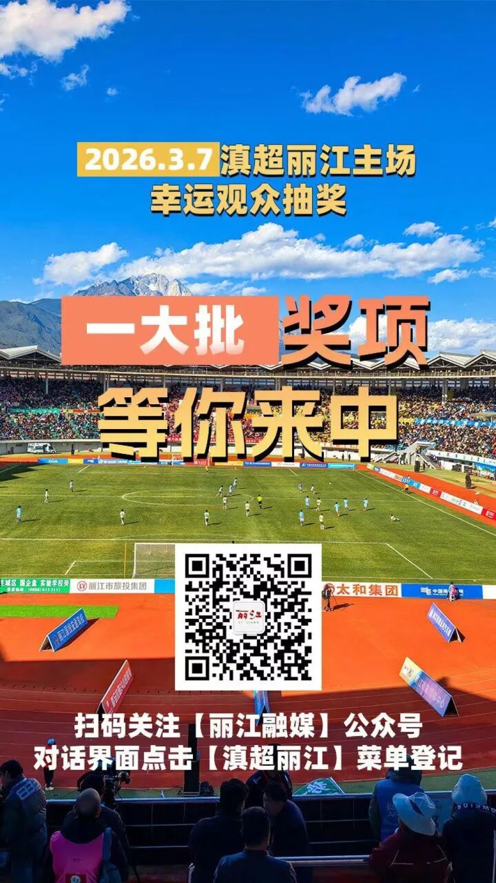 据悉,幸运观众抽奖将于3月7日赛前暖场时段、中场休息时段进行,所有奖项当场抽出。获奖观众可在赛后第1个工作日起7个工作日内,到丽江市融媒体中心1楼登报处领奖。
