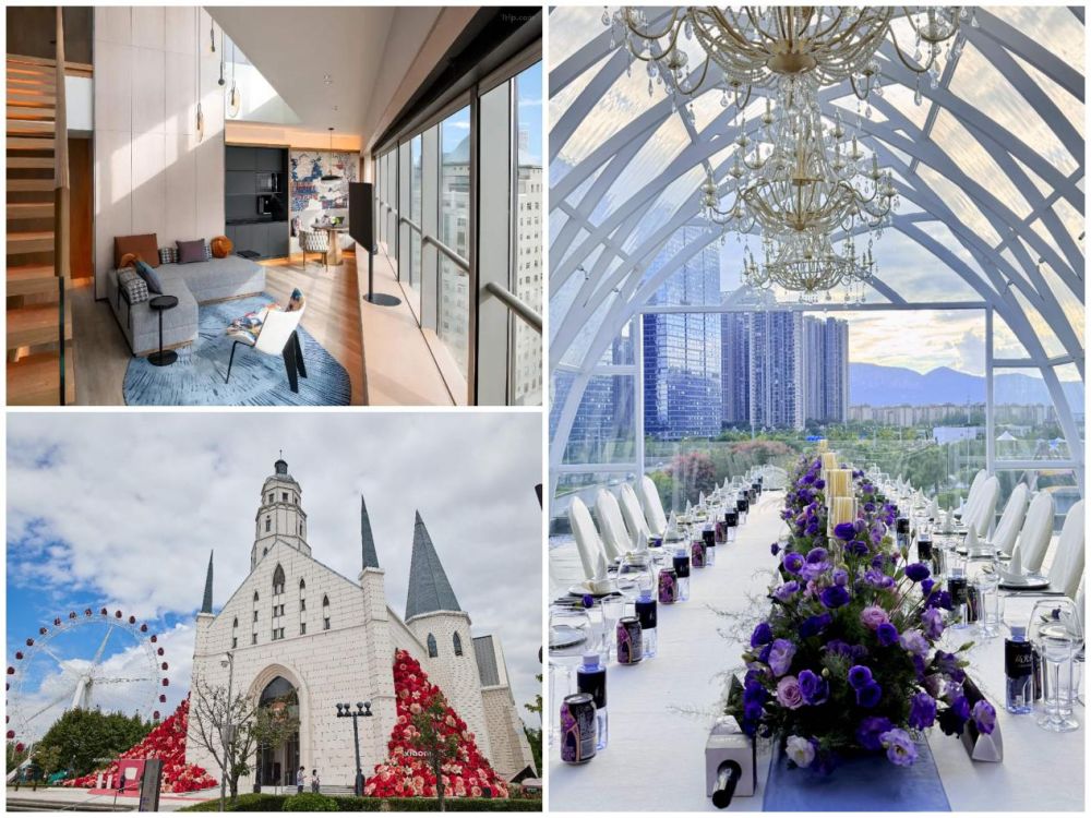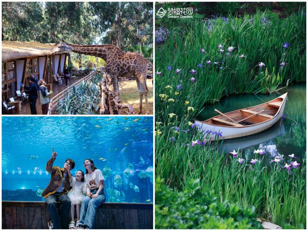 昆明是很多人来了就不想走的城市(图片依次为:云南野生动物园长颈鹿咖啡厅、融创海世界、梦橙花园)