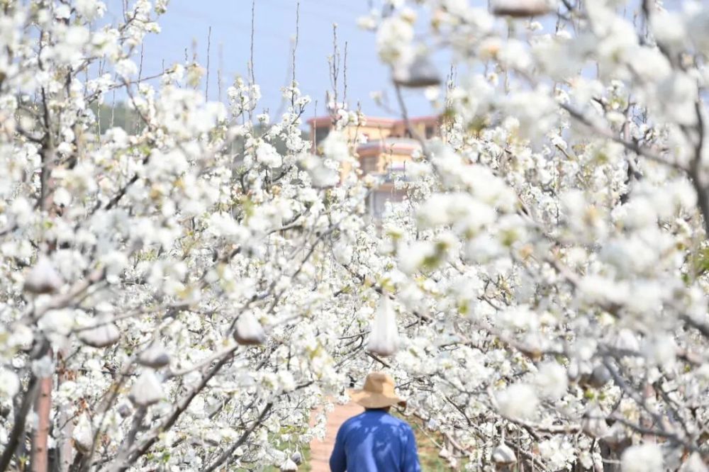 走进梨园深处,仿佛置身一片白色的海洋,朵朵洁白无瑕的梨花点缀树间,散发沁人心脾的花香,随处可见的蜜蜂和蝴蝶在花丛中穿梭。行走其间,抬头是满树繁花,低头是落英缤纷,“千树梨花千树雪”的春日美景跃然眼前。