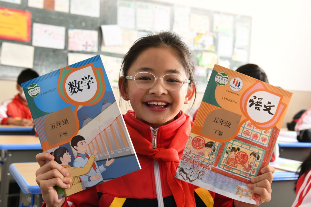 在丽江市实验学校,五年级学生展示刚领取的新书。(丽江融媒记者 赵庆祖 摄)