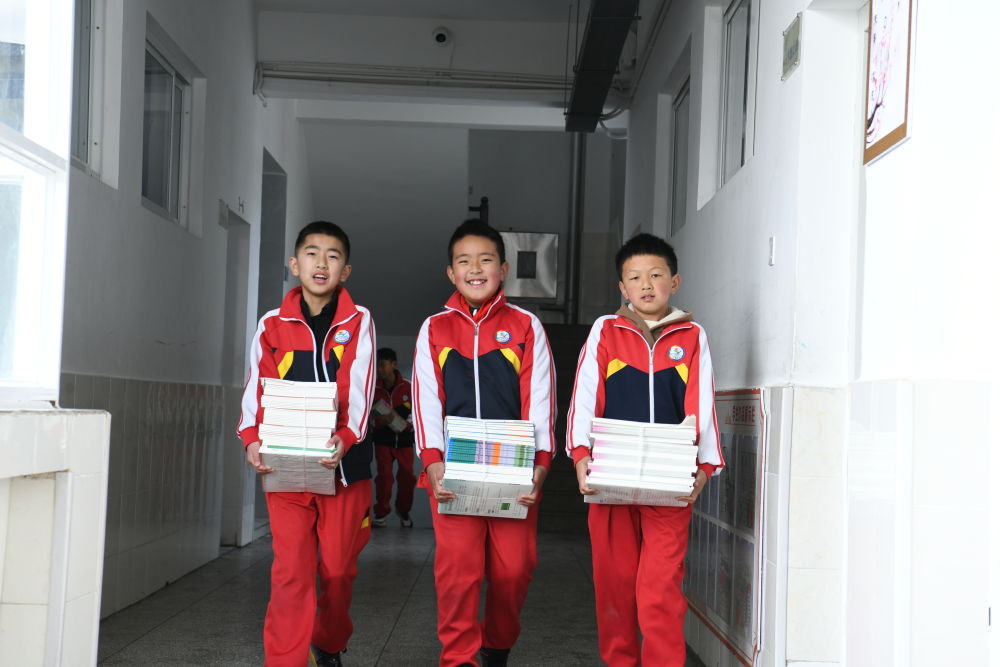 在丽江市实验学校,学生们在搬运新书。(丽江融媒记者 赵庆祖 摄)