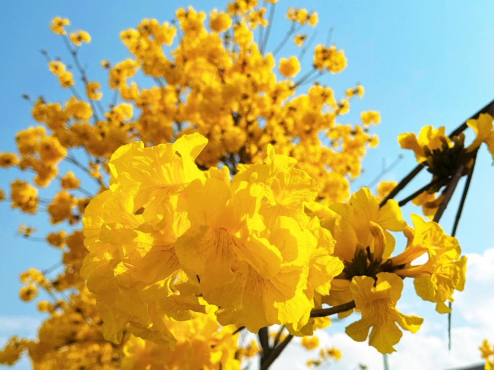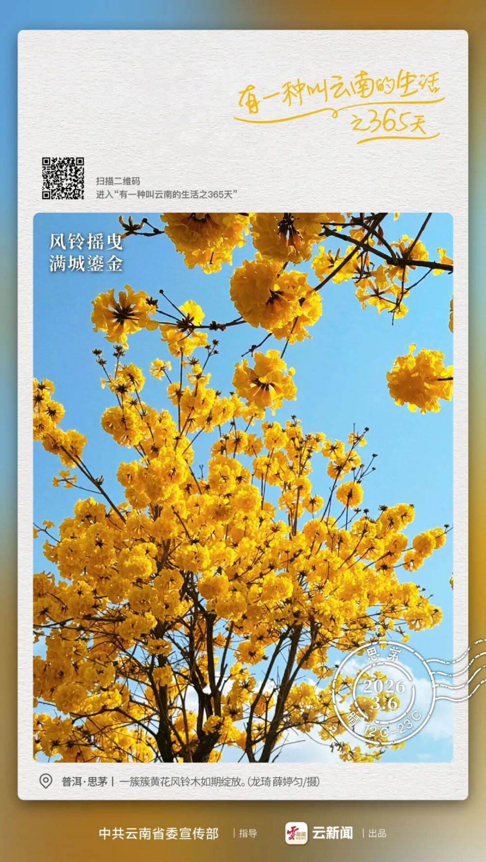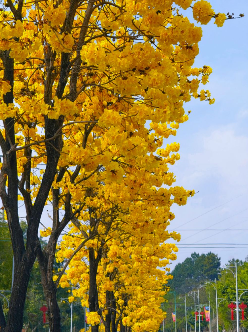 在云南省普洱市思茅区,普洱大道与茶城大道被一树树黄花风铃木点亮。先花后叶,满枝金黄如约而至,漏斗状的花朵簇拥成团,随风轻摇,宛如无数风铃在无声中奏响春的序曲。整条街巷仿佛披上流动的金色绸缎,明媚而不张扬,热烈又不失温柔。