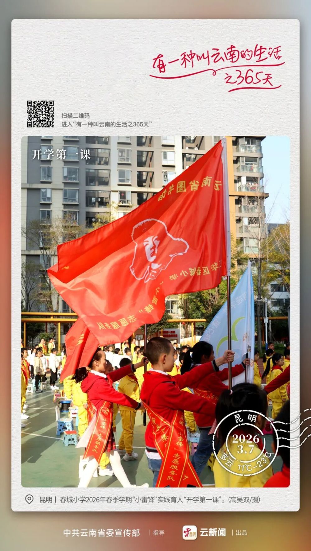 在昆明市春城小学2026年春季学期“小雷锋”实践育人“开学第一课”上,学生们观看学雷锋系列影片视频,并听取老中青三代代表分享传承故事,学习雷锋精神。昆明边检站警官讲述国门卫士的先进事迹,用坚守岗位的奉献经历诠释新时代雷锋精神的内涵。