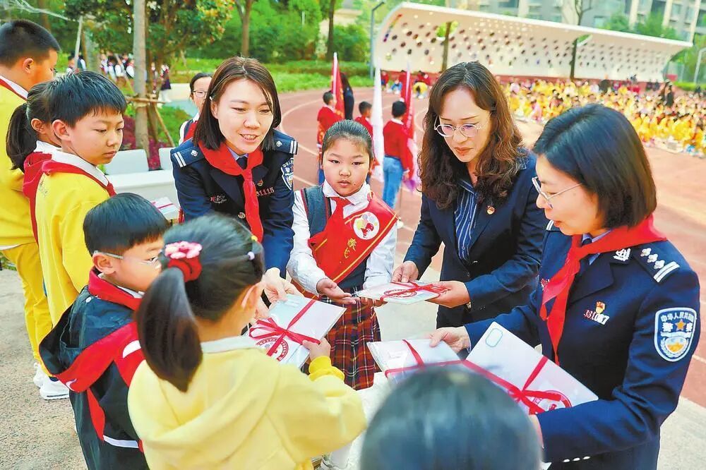 昆明边检站警官向春城小学学生赠送学雷锋日记本。高吴双 摄